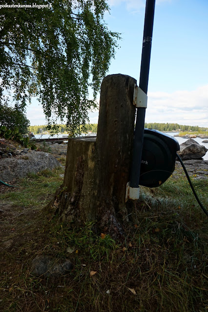 | Savustus penkki on muutamia vuosia sitten kaadetun ison puun kanto, ja siinä on kiinni iso terassivarjo ettei sadekkaan haittaa kokkailuja. |
